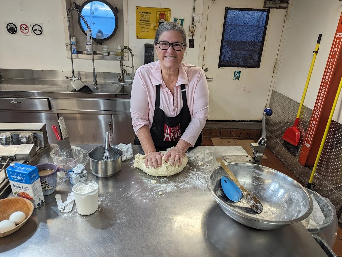 I mentioned to you in my story yesterday that the dough hook was missing from the mixer so I thought I would try and make the bread dough by hand. I have to say, it was easier and more successful than I thought it would be. The results were so good that by the time the bread dough had risen and baked, I was actually happy that the dough hook was missing because I would never have tried making it by hand. There are 27 crew here so it would have been difficult to make that much bread dough in the mixer anyway, so it was meant to be. I shaped the dough into buns to go with Italian sausages. I fried onions and peppers and had garlic mayonnaise to top them off. The second choice was pasta with homemade tomato sauce (Sues tomato oil in the book). The third choice was a fried egg sandwich. I also had rice and sauteed kale mix. It comes in a bag with shaved brussel sprouts and is sold as a salad but it is very good sauteed with olive oil, butter and Adobo. For supper I made beef vegetable stew served with baked mashed potatoes and green peas. The second choice was fish creole. I used the leftover fried onions and peppers from lunch, added some of the tomato sauce, hot sauce, hot peppers, diced tomatoes and some fish soup base. It came out very nice. It will be in the next book. I cut the leftover buns in half and they went well with the beef stew. The soup of the day was Tuscan and I looked into my own cookbook to refresh my mind. It really is a good soup and I remember how much my customers loved it when we served it our the restaurant years ago.