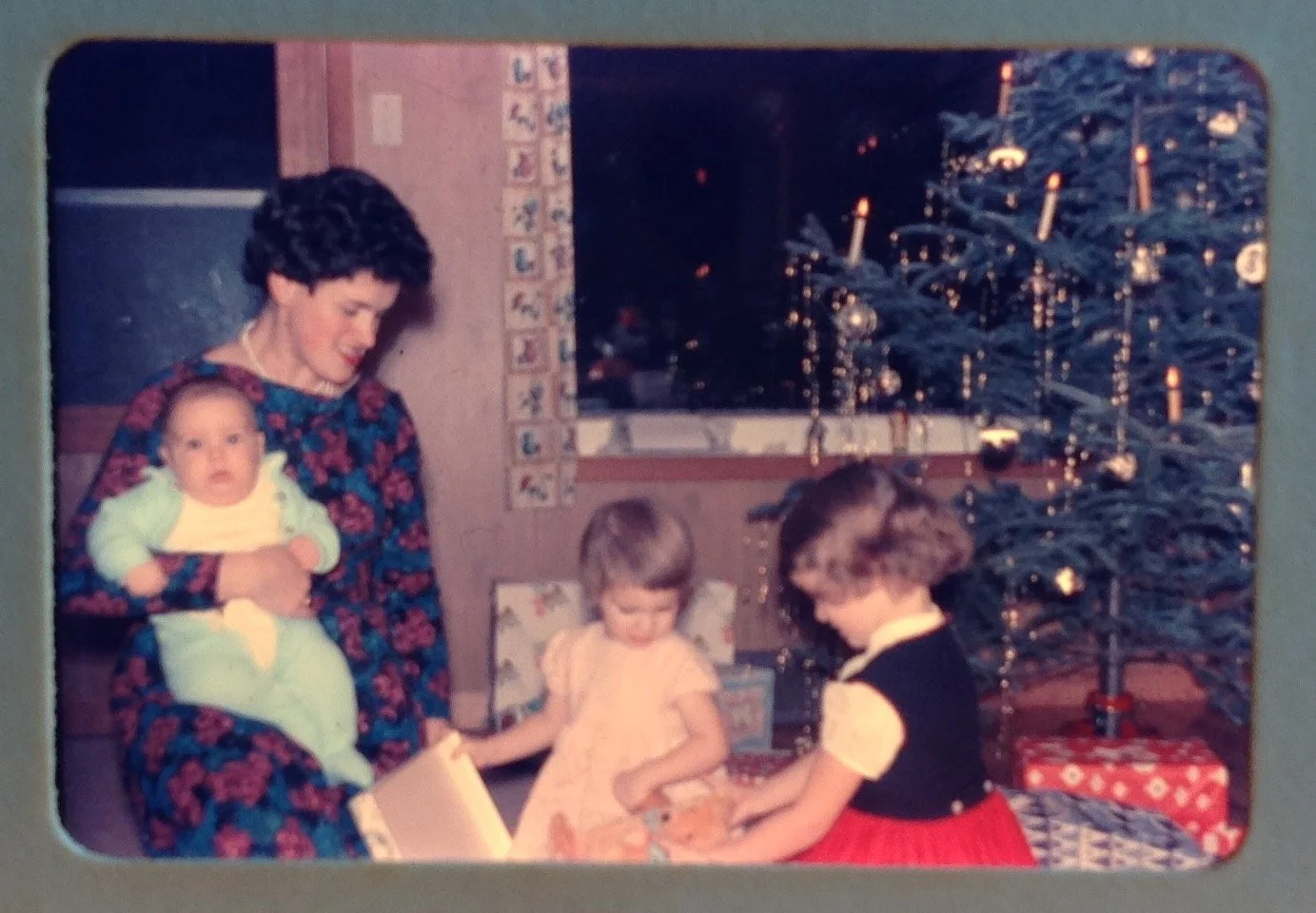 my mom looked so beautiful. There are the candles burning again. Christmas Eve opening the gifts. Lorraine is four months old there.