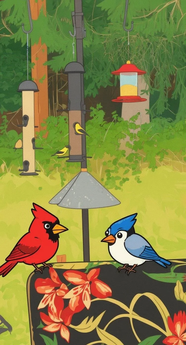 Each day when we are home, we go for a walk and after one of our walks we stopped at neighbor Susans for a visit. We sat and enjoyed watching the birds at their feeders. We always enjoy a visit with neighbor Susan and her husband Luc. The conversations often lead to how much they miss eating the crepes that we made when we had our Creperie restaurant. We promised that we will make them some crepes in September when we return from our girls trip to the cottage. I can't wait to go to the cottage and I sent out a message saying that I am taking requests and would be happy to organize the suppers and everyone could bring what they like for breakfast. Lorraine has been busy baking cookies. Her delicious cookies are made with no sugar, flour or grains.) They are so delicious, and the girls will love them. As I look down to the bottom right-hand corner of my laptop, I realize that I have gotten carried away with stopping to transform my original photos into cartoons and will have to bring this to an end. We are going for a walk this afternoon and I want to make sure to share this with you before I go. Have a wonderful fun day and week.